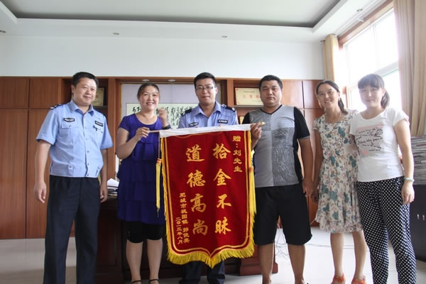 失主尋找了多個交警大隊,終于在開發區大隊尋找到拾金不昧的協警劉衛彬,當面向劉衛彬表示了感謝,并立即送上錦旗,贊揚劉衛彬“拾金不昧,道德高尚”。